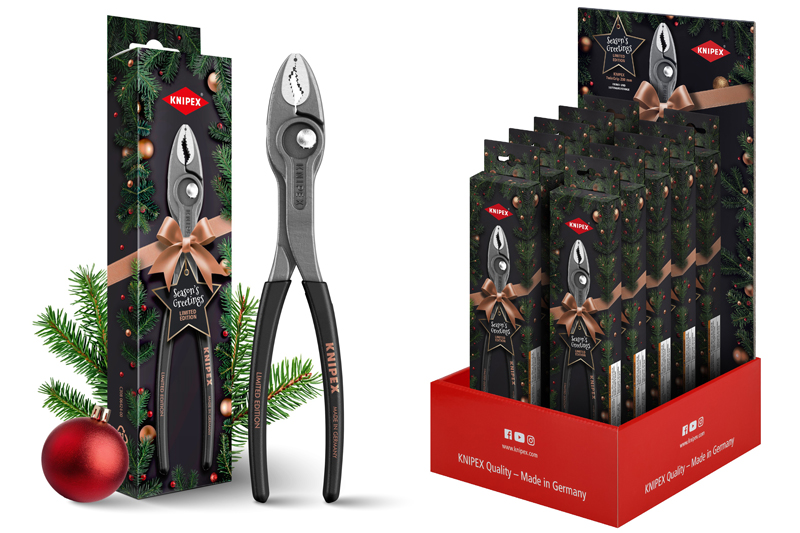 Each pair is boxed in eye-catching seasonal packaging, giving merchants a ready-made gift opportunity for the trade. KNIPEX has also created a dedicated festive counter display in matching festive colours. Compact but striking, it holds up to 10 pairs and is designed to sit neatly on the trade counter where customers can see and handle the product.